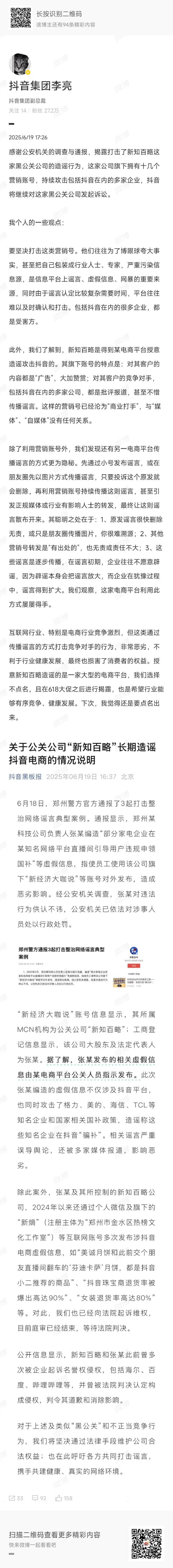 抖音集团副总裁李亮转发该文表示,“新知百略是得到某电商平台授意造谣攻击抖音的。其旗下账号的特点是:对其客户的内容都是“广告”,大加赞赏;对其客户的竞争对手,包括抖音在内的多家公司,都是批评报道,甚至不惜传播谣言。这样的营销号已经沦为“商业打手”,与“媒体”、“自媒体”没有任何关系。”